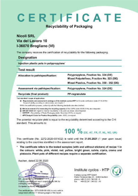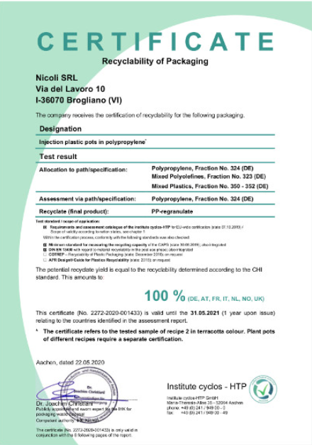 Strengthened by our experience in the horticultural sector where we have been using recycled raw materials for years, we have decided that even the production of today's garden pots and planters must take place using as much recycled plastic as possible. We all feel responsible for the world we live in, that’s why Nicoli strongly believes in the economic cycle of raw material reuse. By using what has already been produced so far without requiring new production of raw materials, we greatly reduce the consumption of resources and energy needed to produce it, therefore lower environmental impact.
